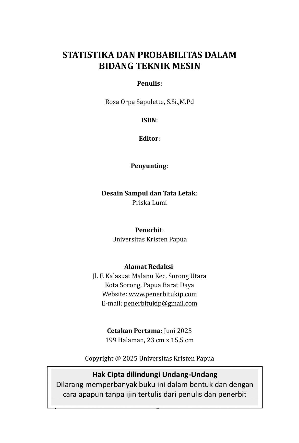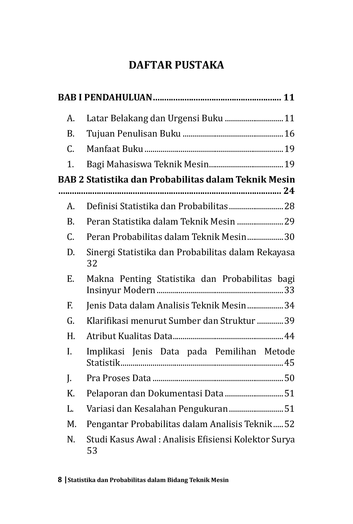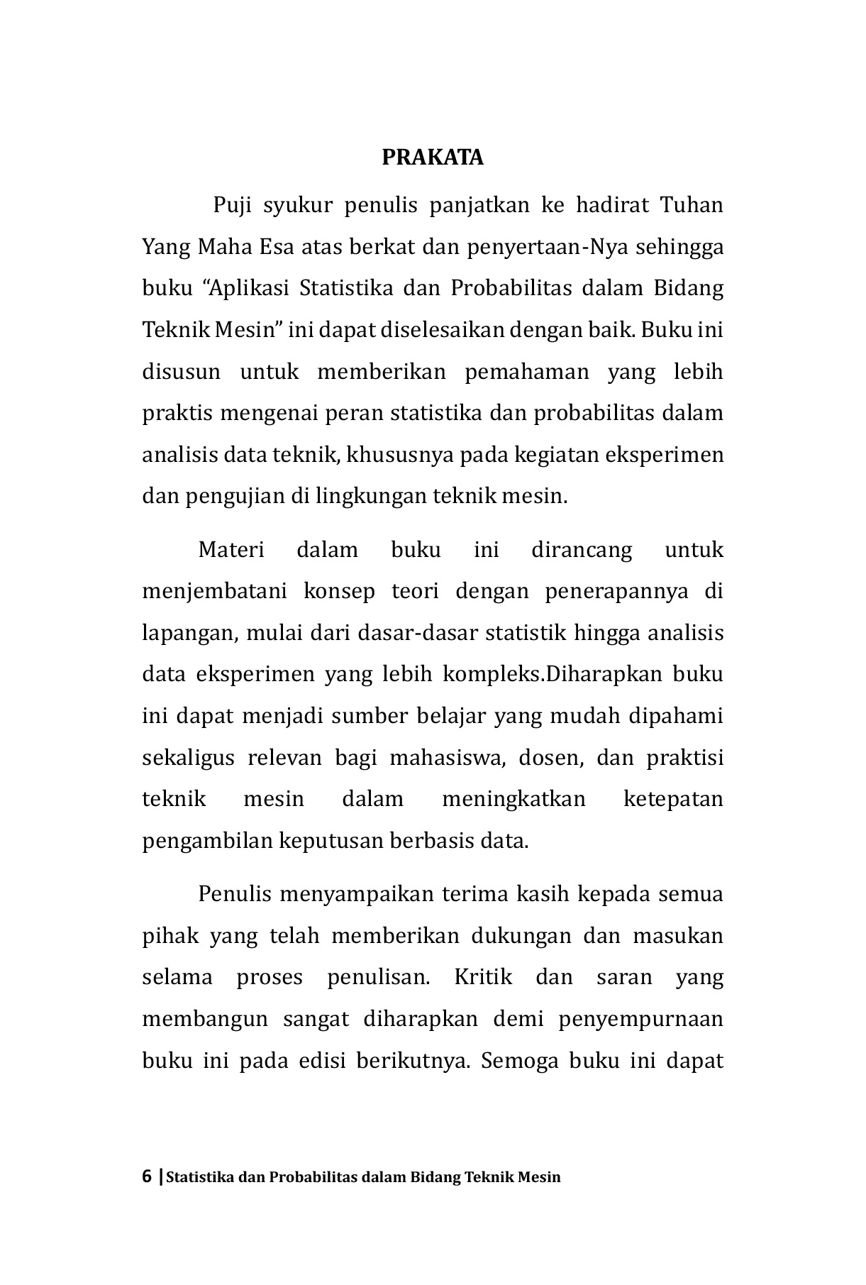 Materi dalam buku ini dirancang untuk menjembatani konsep teori dengan penerapannya di lapangan, mulai dari dasar-dasar statistik hingga analisis data eksperimen yang lebih kompleks.Diharapkan buku ini dapat menjadi sumber belajar yang mudah dipahami sekaligus relevan bagi mahasiswa, dosen, dan praktisi teknik mesin dalam meningkatkan ketepatan pengambilan keputusan berbasis data.